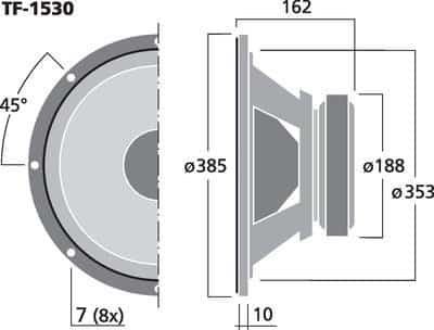 les haut-parleurs de la série TF se caractérisent pas un excellent rapport prix/performances pour des qualités sonore excellentes et sont adaptés pour des applications dans des systèmes puissants. Haut-parleur de grave professionnel, 800 WMAX, 400 WRMS, 8 ohm Grave, 38 cm (15), rendement élevé