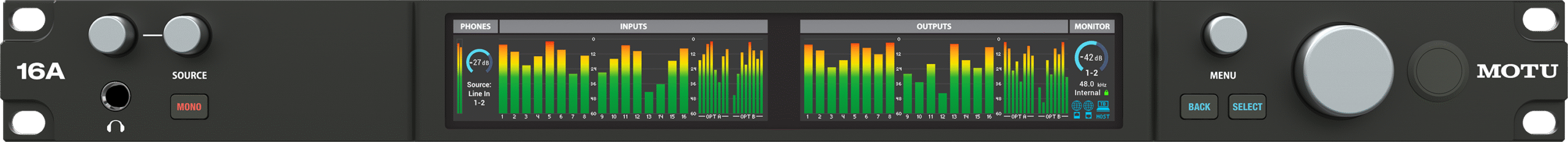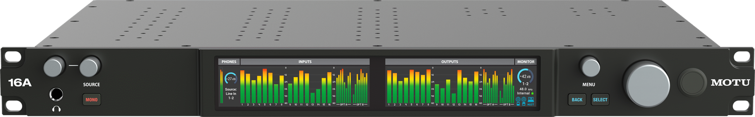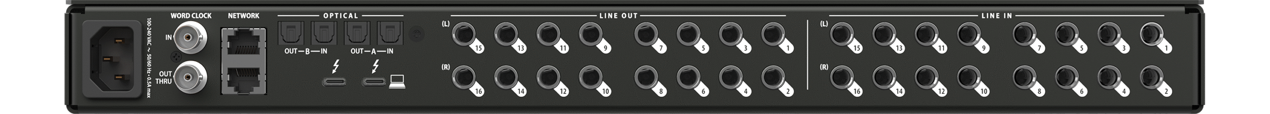 16 sorties analogiques TRS 1/4″ (symétriques, DC couplées), niveau max +21 dBu