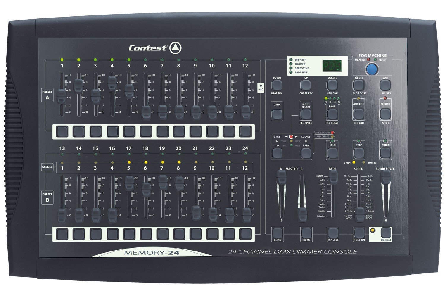 • Jeu d’orgue 24 circuits à mémoires • 2 préparations de 12 circuits ou 1 préparation 24 circuits • Flash sur chaque circuit • 4 600 mémoires, 48 séquences programmables • Fondu enchaîné • Programmation, modification d’une scène en direct ou en aveugle • Vitesse et temps de montée des séquences ajustables • Sauvegarde des mémoires en interne • Possibilité de mixer plusieurs séquences • Détection musicale par microphone intégré ou source externe • Déclenchement manuel des séquences par Tap synchro • Déclenchement des scènes et des séquences en MIDI • Sortie DMX 512 sur fiche XLR 3 broches • Alimentation externe (DC 9 V – 12 V, 500 mA) • Fournie d’origine avec coque synthétique noire amovible de protection • Equipement standard : 1 alimentation externe • Construction : coffret en tôle d’acier • Dimensions : 483 x 265 x 90mm / rack 19” • Poids : 4,6 kg