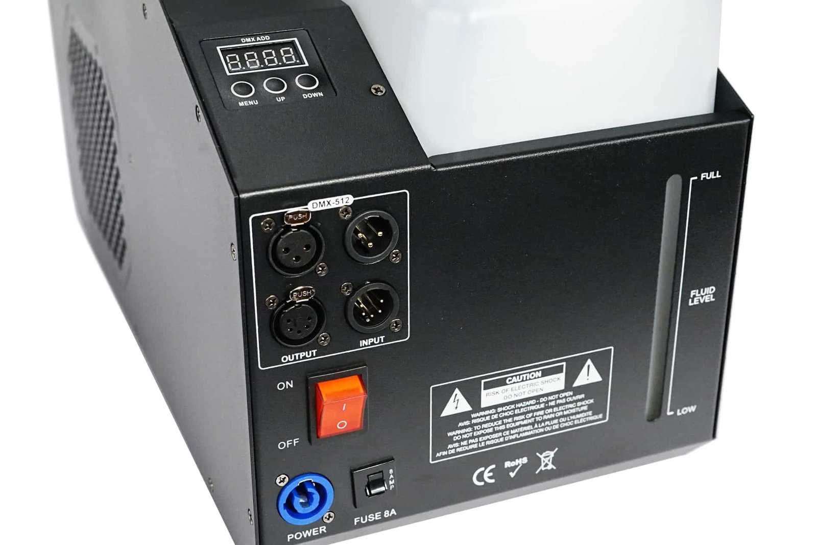Machine à fumée professionnelle à grand rendement de 1200 watts, contrôlée par le tableau de bord, DMX 512, fonctionnement à sec et sans arrêt, consommation de liquide 0.524ml/min, auto-nettoyage.