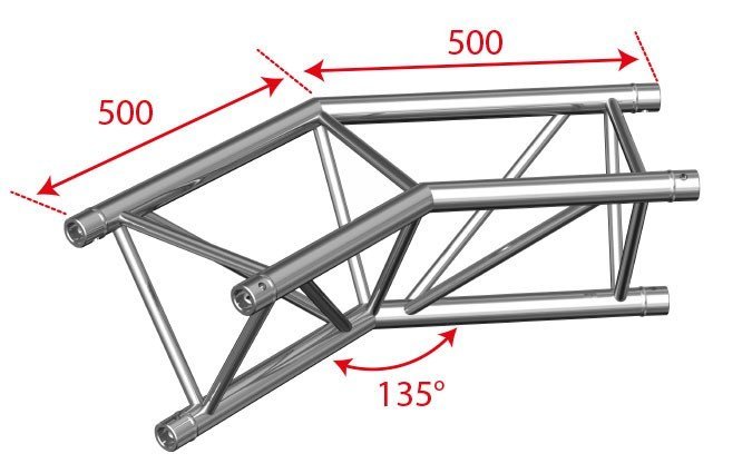 Angle Trio 2 directions 135° Fabrication répondant aux normes ISO DIN 4113 et TÜV.Structure en alliage d’aluminium (EN AW 6082 T6).L’utilisation des jonctions coniques et des clavettes permet une mise en oeuvre très rapide de tous les types de configurations alliant une grande robustesse à une stabilité irréprochable. Le démontage est lui aussi rapide et facile. Livré avec : 1 kit de jonction• Tubes de 50 mm• Filets de 16 mm• Section triangulaire de 240 mm d’entraxe entre chaque tube (290 mm extérieur)• Assemblage par manchon à goupille conique et clavette• Angle – 2 directions : 135°• Utilisation : jonction horizontale, pointe en bas• Encombrement maxi : 500 mm x 500 mm• Poids : 4,8 kg