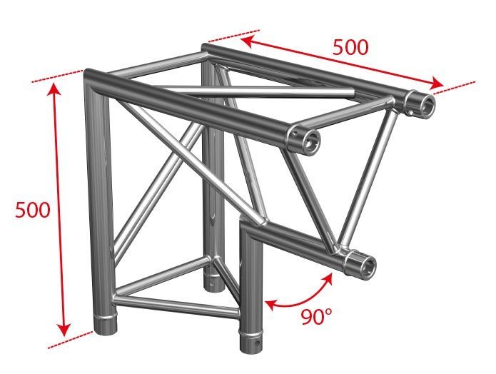 Angle Trio 2 directions 90° sommet intérieur Fabrication répondant aux normes ISO DIN 4113 et TÜV.Structure en alliage d’aluminium (EN AW 6082 T6).L’utilisation des jonctions coniques et des clavettes permet une mise en œuvre très rapide de tous les types de configurations alliant une grande robustesse à une stabilité irréprochable. Le démontage est lui aussi rapide et facile. Livré avec : 1 kit de jonction• Tubes de 50 mm• Filets de 16 mm• Section triangulaire de 240 mm d’entraxe entre chaque tube (290 mm extérieur)• Assemblage par manchon à goupille conique et clavette.• Angle – 2 directions : 90°• Utilisation : jonction horizontale/verticale, pointe en bas• Encombrement maxi : 500 mm x 500 mm