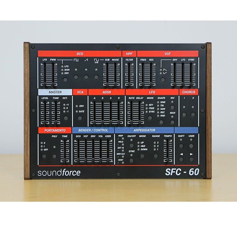 The SoundForce SFC-60 V3 is a boutique class-compliant USB-MIDI controller dedicated to the fantastic TAL-U-NO-LX Juno-60 emulation. The original SFC-60 was the first SoundForce product to come out. I have come a long way since 2014 and this new version is based on all the lessons learned from several years of designing and manufacturing similar products. With a solid sheet metal case, colorful front panel and new software integration, it’s my favourite controller so far. It is usable with any MIDI-mappable software or hardware but has special integrations with the TAL-U-NO-LX.