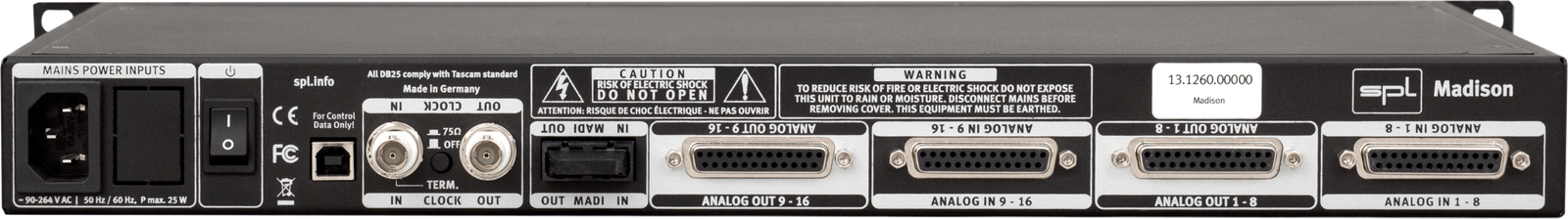 Le convertisseur Madison de SPL AN/NA est muni de 16 canaux d’entrées ainsi que 16 canaux de sortie dans une unité de rack. Cet appareil associe la conversion du signal avec un traitement MADI et un World Clock.