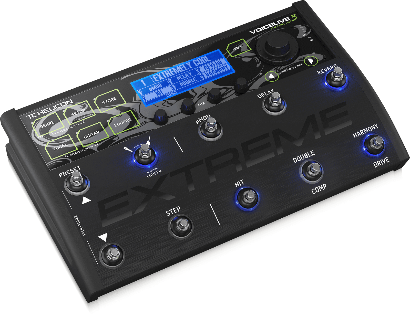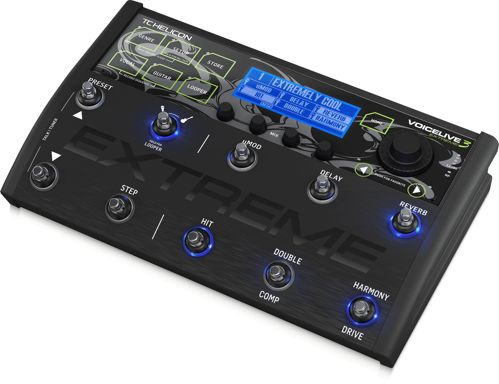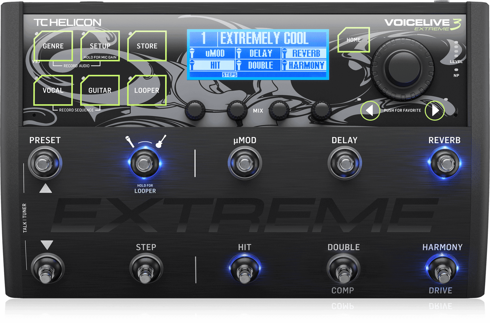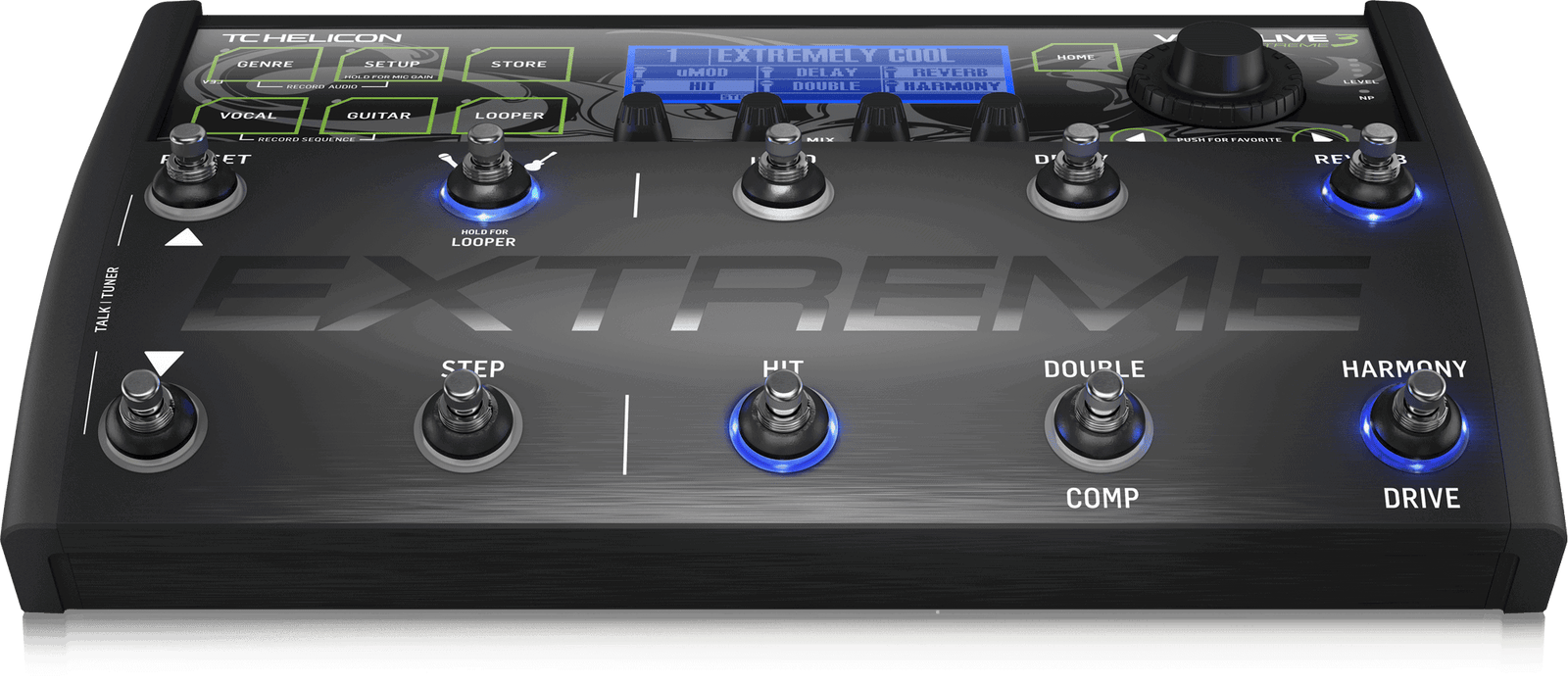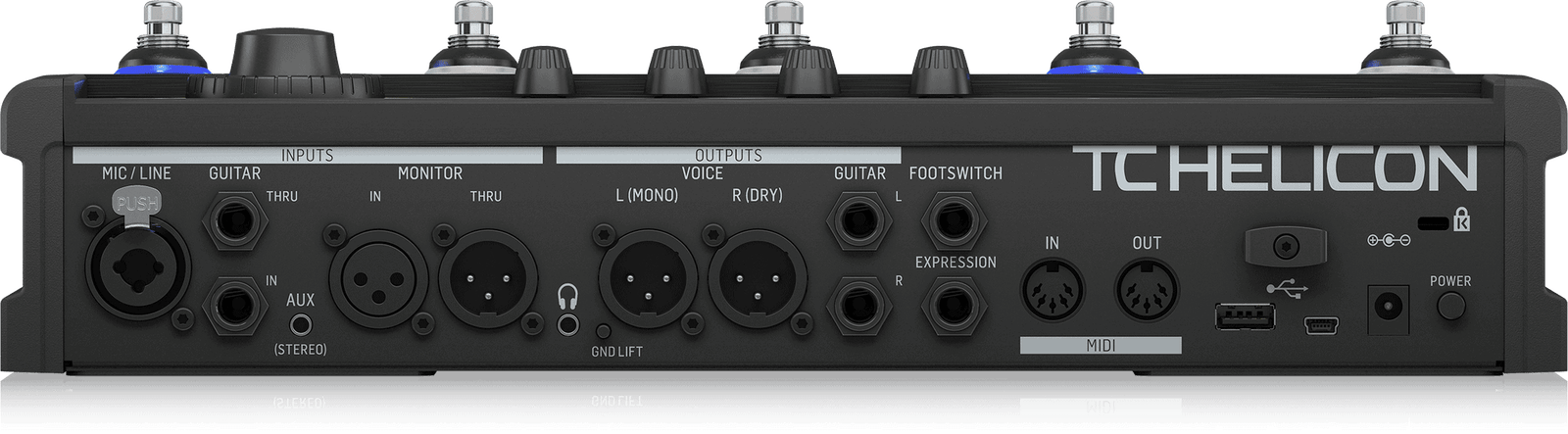 - 6 commutateurs au pied assignables par préréglage pour activer / désactiver les blocs d’effets