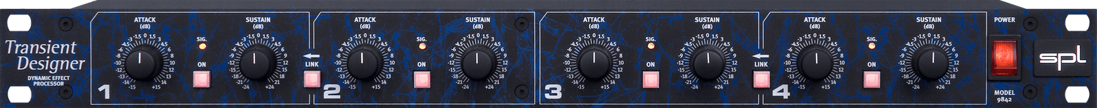 Le Transient Designer est un processeur de dynamique 4 canaux (entrées/sorties XLR symètriques) d’un genre vraiment unique ! Il permet de travailler sur l’enveloppe d’un signal grâce à ses deux potentiomètres (par canal) qui agissent en temps réel sur l’attaque et le sustain. Sans le moindre effort, vous pouvez écourter ou rallonger l’attaque de tous signaux percussifs tel que les pieds, caisses claires, toms, congas, etc. afin de leurs apporter tout « l’impact » ou la « douceur » que vous recherchez. Mais les applications peuvent s’étendre à d’autres sources comme les voix, les guitares, slap bass, et même pourquoi pas, les sons « Leads » de vos synthés favoris.