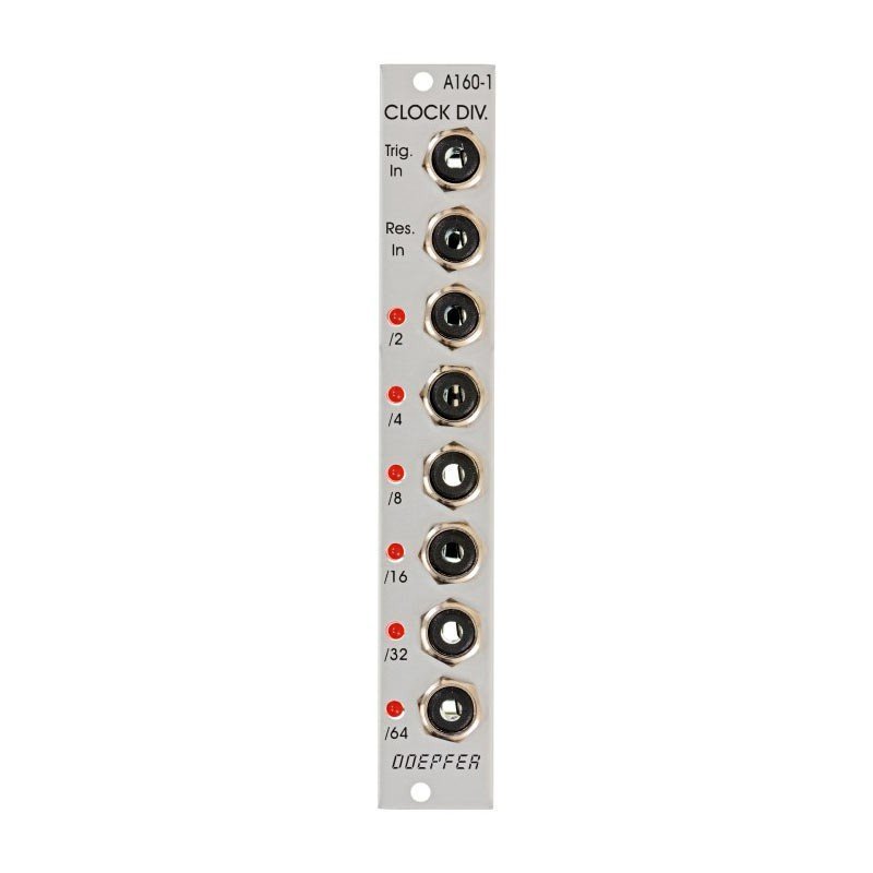 DetailsThe clock divider analyses an incoming clock and divides it by 2, 4, 8, 16, 32 and 64. Each divisor has a separate gate output and their activities are displayed with individual LEDs.A trigger impulse at the reset input zeroes the entire module.miscellaneousThe A-160-1 is expandable by the A-161 Clock SequencerconnectorsTrigger input, reset input, six divider outputsdimensions3U Eurorack module, 4HP wide, 40mm deepCurrent draw: 40mA at 12V and 0mA at -12V