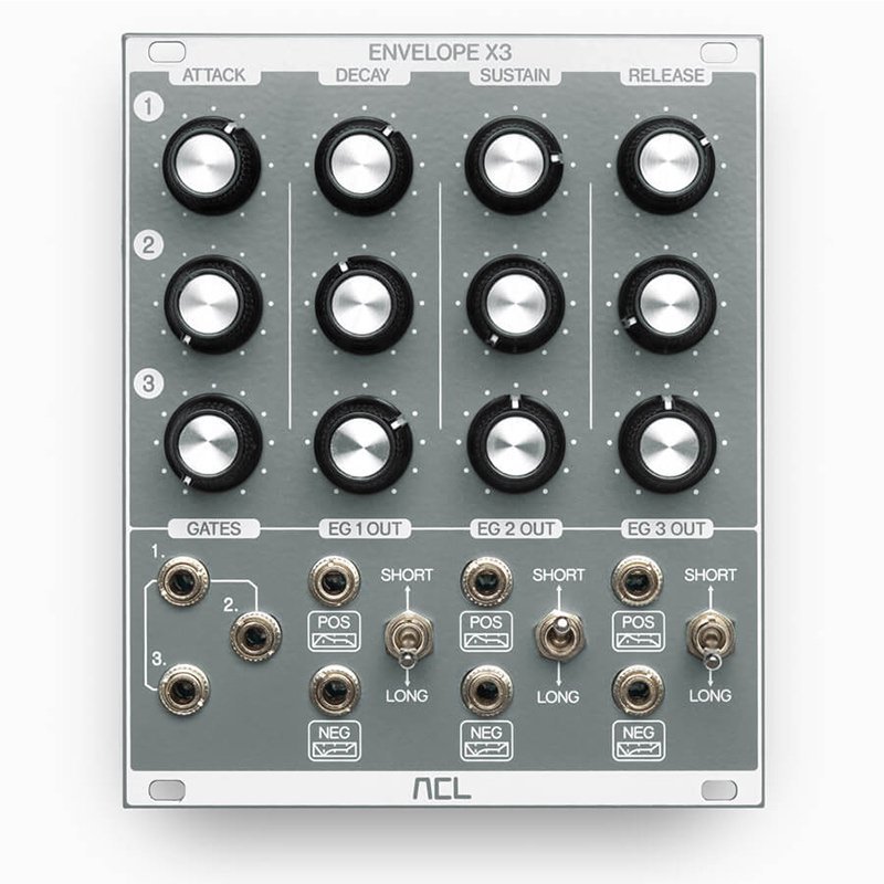The ACL Envelope X3 provides three classic ADSR envelopes for controlling VCAs, VCFs, and other modules. We modelled the envelopes on those of the acclaimed Roland 100M modular synthesiser, which are renowned for their punch. As ever, we wanted to add something extra, and so shortened the envelope time parameters even further – thus, our truly lightning-fast responses make Envelope X3 particularly excellent for drums, bass, and other sounds that benefit from fast and tight envelopes. But fear not, it is not a one trick pony, offering both Long and Short modes, with those ranges overlapping, making it perfectly suited to pads, drones, and similar sounds too.