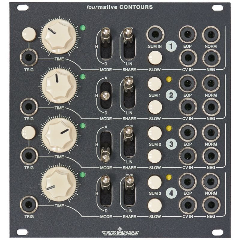 Fourmative Contours consists of four identical envelopes with positive and negative outputs. Each unit has a trigger input for firing the envelope. This is visualized by a green LED. The second and third units can also be triggered manually with the help of the trigger button.