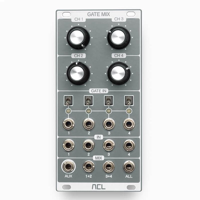The Gate Mix is composed of four channels. Each features a level potentiometer and a mute stage. The latter can be controlled via a switch or a gate input. Besides the master connector, there are two additional outputs, which emit a mixture of channel one and two respectively three and four. Therefore, it is not only possible to use the module as one four channel mixer, but also as two mixers with two channels each.