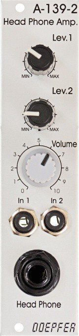 two-channel headphone amplifier two audio inputs with level controls Input 1 is normalled to Input 2 common loudness/master level control headphone output (stereo 1/4″ jack socket) max. output power ~ 2 W per channel (@ 8 Ohm load) DC coupled inputs and outputs (i.e. also useful for other applications like small loudspeakers, lamps, LEDs, magnets, motors – provided that the power is sufficient) 120 mA 12V ? mA -12V ? mA 5V 40 mm Depth