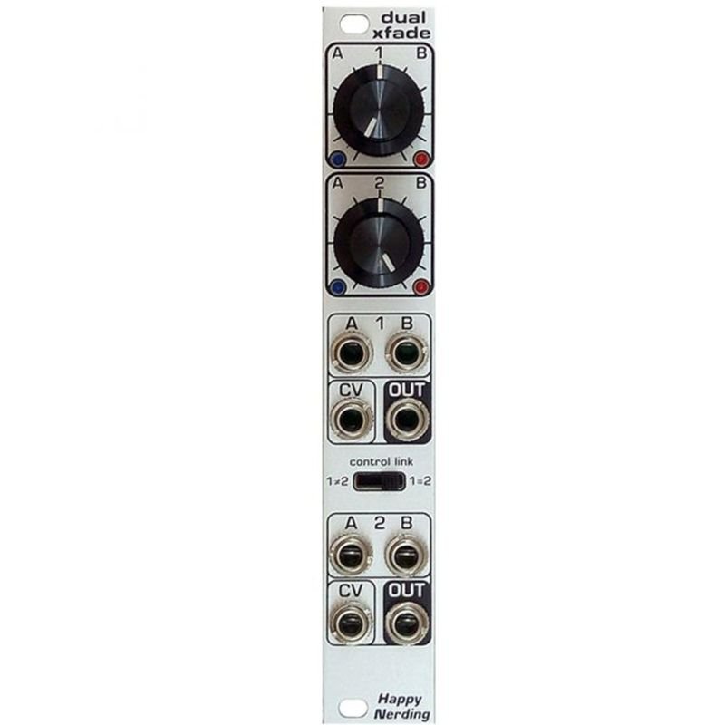 Smaller knobs set manual crossfade between A<>B, and bigger knobs are CV attenuverters. LEDs show the adjusted positive and negative CV sides for easy monitoring.