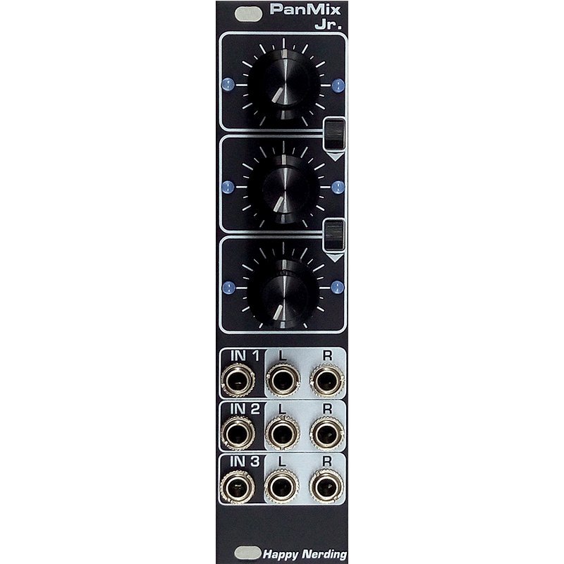 Several modules can be chained together via connections on the back side. This connection is possible with other Happy Nerding stereo modules too. At the moment PanMix Jr stereo output can be internally send to 3x Stereo Mixer and Isolator module. Or stereo signal can be received from OUT, 3x Stereo Mixer and latest revision of PanMix.