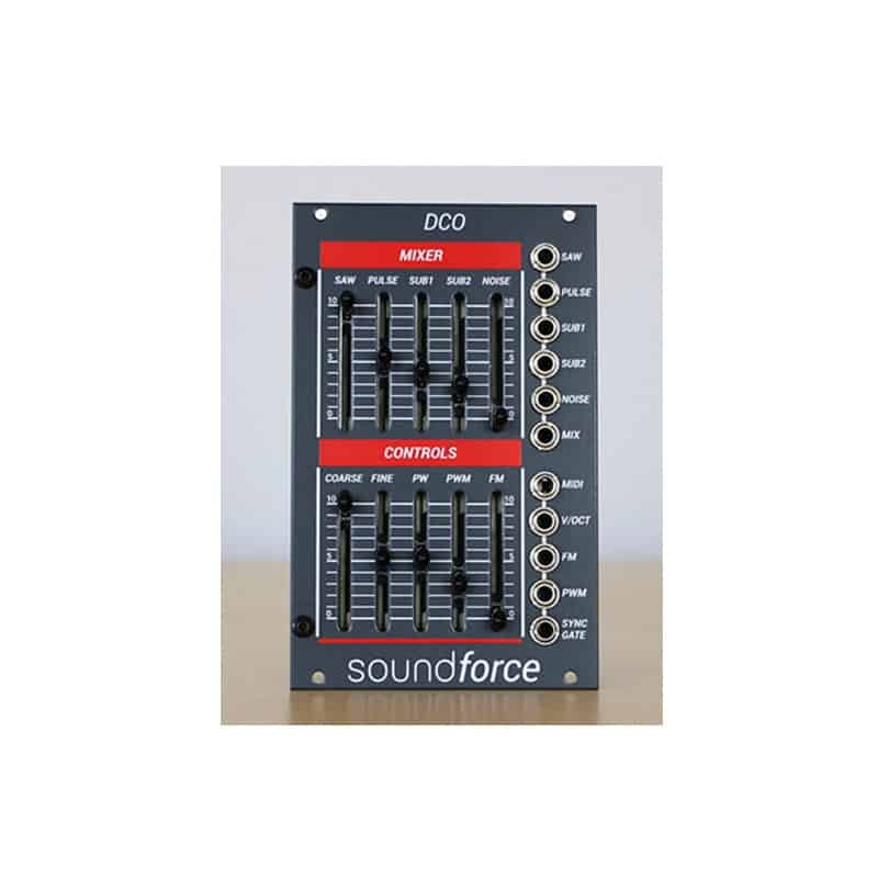 The SoundForce DCO features 10 slide pots (faders) reminiscent of the Roland synths. 5 sound sources are available: SAW, PULSE, SUB1 (1 octave lower), SUB2 (2 octaves lower) and NOISE. The built-in mixer allows you to mix them together using the faders and the MIX output jack. The PULSE has manual pulse width control, as well as PWM with a CV input and an attenuator. An FM input is also available with an attenuator. The oscillator can be hard synced to another oscillator using the SYNC input.